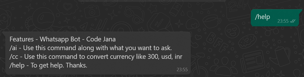 Supercharge your Whatsapp experience with AI integration. You'll get Whatsapp Openai chatbot & currency converter. Connecting the bot to super-easy. You only need to replace your Twilio api creds and message response url in Twilio sandbox configuration. Complete video tutorial is included in the description.